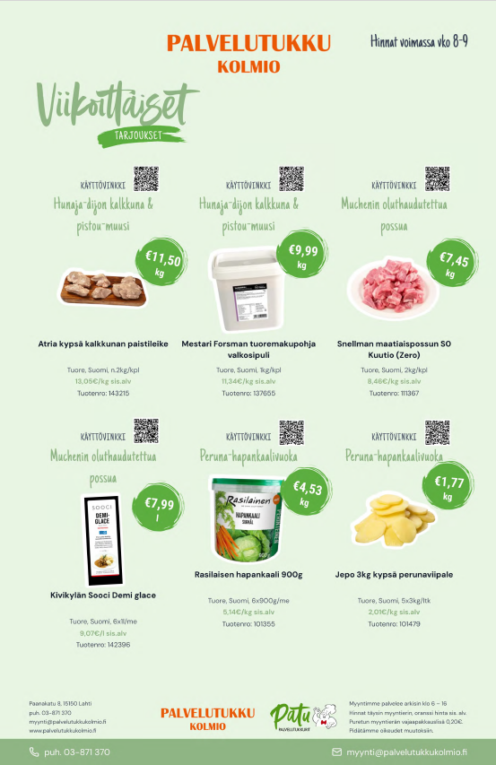 Tilaamme tuotteet molempiin ravintoloihin itse Palvelutukku Kolmiosta. Yhteistyö on ihan loistavaa. Meillä on pienet säilytystilat, ja saamme joustavasti kuormat joka päivä. Meitä palvellaan puhelimessa, ja kiireen keskellä voi antaa tilauksen suoraan omalle luottohenkilölle. Saamme samalla ideoita ja ehdotuksia lounastarjouksista ja jos tarvitsemme jotain erityistä, se hankintaan meille aina.