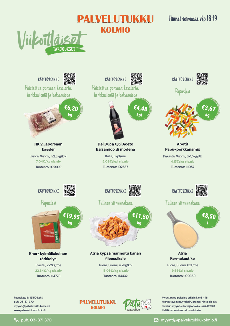 Tilaamme tuotteet molempiin ravintoloihin itse Palvelutukku Kolmiosta. Yhteistyö on ihan loistavaa. Meillä on pienet säilytystilat, ja saamme joustavasti kuormat joka päivä. Meitä palvellaan puhelimessa, ja kiireen keskellä voi antaa tilauksen suoraan omalle luottohenkilölle. Saamme samalla ideoita ja ehdotuksia lounastarjouksista ja jos tarvitsemme jotain erityistä, se hankintaan meille aina.
