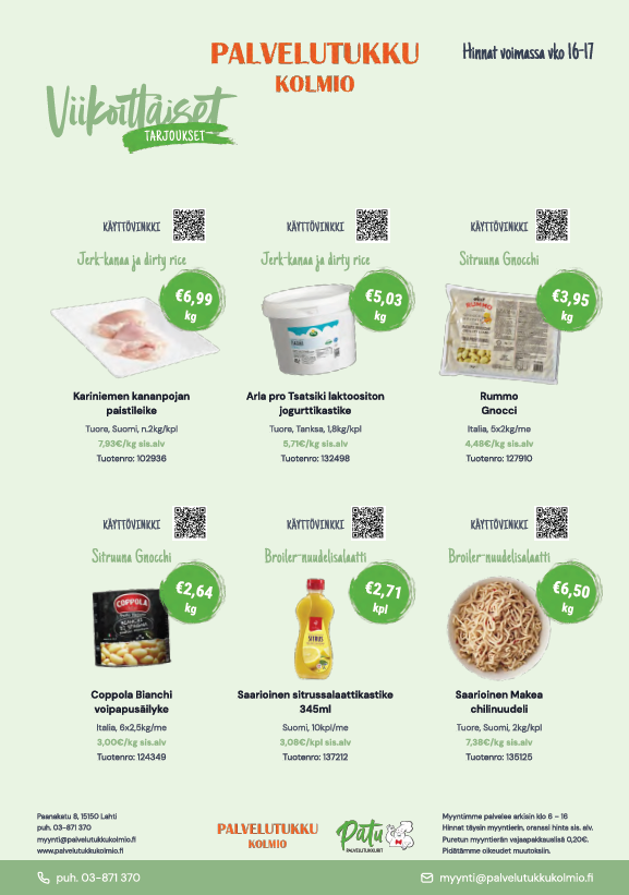 Palvelutukku Kolmion vahvuuksia ovat toimitusvarmuus, asiakaspalvelu ja kilpailukykyiset hinnat. Voimme luottaa siihen, että kuormassa tulee kaikki tilatut tuotteet ja takuulla tuoreina. Oma vastuumyyjä on nopeasti tavoitettavissa ja häneltä saadaan tietoa myös uusista tarjouksista. Kokonaisuudessaan ollaan erittäin tyytyväisiä yhteistyöhön Palvelutukku Kolmion kanssa.